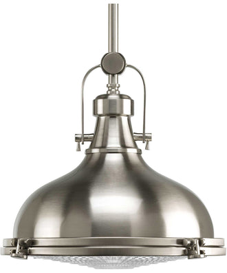 The Fresnel Lens LED Clear Fresnel Glass Coastal Pendant Light in Brushed Nickel is a stunning addition to any space, blending industrial roots with a touch of coastal charm. This one-light pendant features a sleek and sophisticated Oil Brushed Nickel finish that highlights its high-quality prismatic glass. The antique-inspired fixture includes a hinge-locking nautical design, adding a historical aesthetic that enhances the overall appeal of your decor.