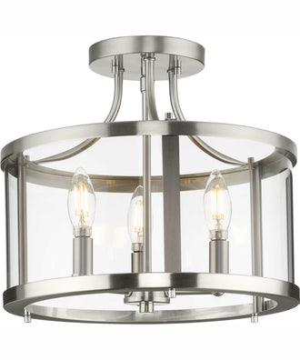 The Gilliam 13 in. 3-Light New Traditional Semi-Flush Mount in Brushed Nickel is a stunning addition to any home, offering an ethereal quality with its slim circular silhouette. The fixture features clear curved glass that enhances its classic form, exuding simple elegance and sophistication. The brushed nickel finish adds a subtle yet striking touch of modernity, making it a versatile piece that complements various interior styles, from new traditional to modern farmhouse and transitional settings.