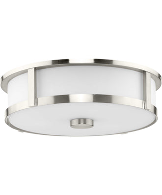 The Gilliam Flush Mount delivers an ethereal quality expressed by its slim circular silhouette finished in Brushed Nickel. Etched white curved glass enhances the ceiling light’s classic form with simple elegance. The 16 inch diameter light is perfect where a larger flush mount is needed.