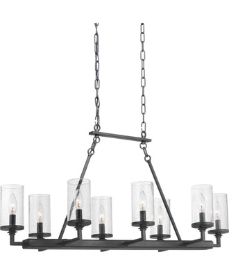 Graphite finishes and organic seeded-glass shades form the basis of this collection that channels traditional iron structures. This eight-light linear chandelier is perfect over a long farmhouse dining table or library table. The fixture feels most at home in a traditional or farmhouse-style setting. With hand-forged details, the dark graphite frame makes this light a dramatic focal point. Measures 38in L x 17-1/2in ht. x 13 /78in w. Uses eight, 60-watt max. candelabra base bulbs including LED equivalent (sold separately). Compatible with standard wall dimmer. Progress Lighting products are designed for exceptional quality, reliability, and functionality. Includes installation instructions and mounting hardware. Coordinating fixtures available