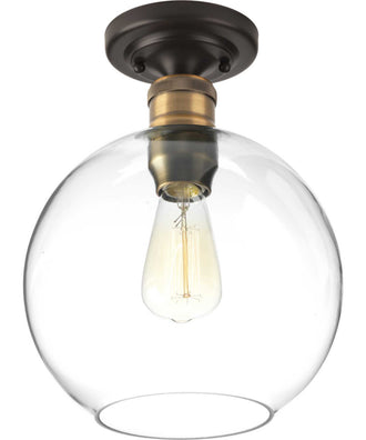 The Hansford collection of fixtures feature a clear, spherical shade paired with vintage style metal fittings in an antique bronze and brass combination finish. Featuring a clean and precise design with generous scale, Hansford's classic style brings tranquility to your home with. Hansford lends itself to Farmhouse, Coastal or Industrial interiors. Can be used with clear or vintage bulbs for a variety of looks. The one-light flush mount is ideal for bedrooms, bathrooms, hallways and closets.