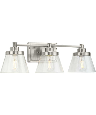Ideal for a bathroom. Perfect for farmhouse and transitional style settings. Beautiful brushed nickel finish. Clear seeded glass. Mount the light fixture facing up or down. Uses 3 medium base base bulbs that are sold separately (60 W max - LED/CFL/incandescent). Measures 7-3/4-inch height by 24-1/2-inch length by 7-3/25-inch width (extends from wall). Certifications: cULus Damp Location Listed. Pairs with a variety of lighting fixtures by Progress Lighting. Our 1-year Limited Warranty guarantees your complete satisfaction with your purchase and includes professional after-sales customer service