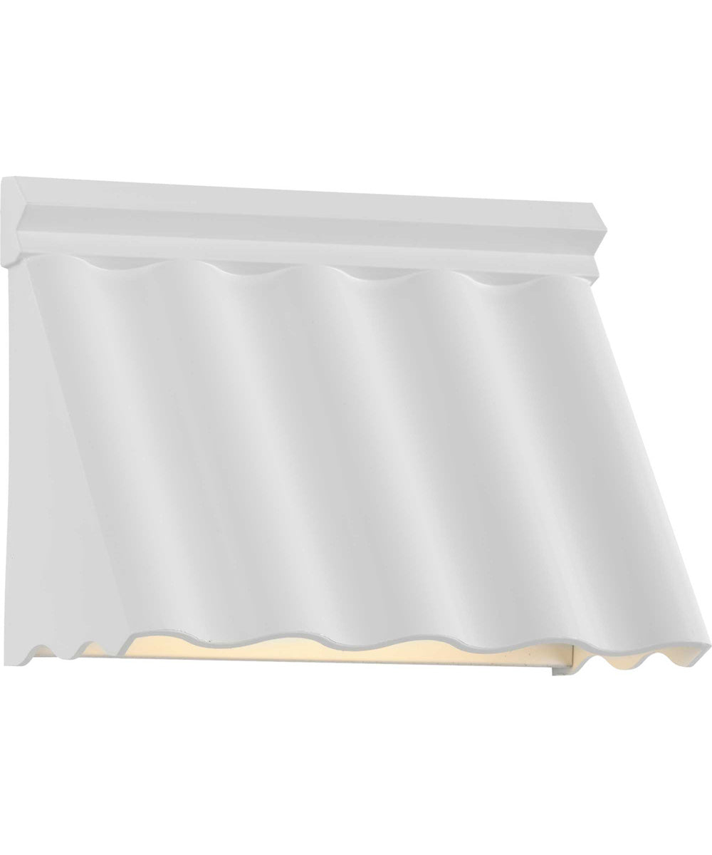 This wall lantern boasts a unique shape with a softly waved sconce frame that mimics the look of corrugated roofs. Its shelter white finish provides a clean, crisp appearance that complements various exterior styles, from farmhouse to modern and transitional. The rectangular canopy and clear etched glass shade add to its sophisticated charm, making it a versatile addition to any home.