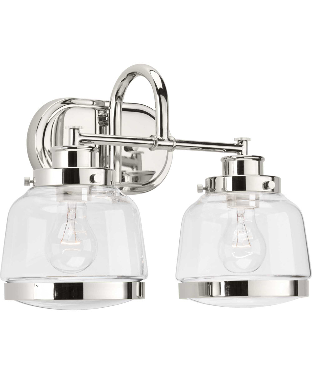 Ideal for a bathroom and powder room. Perfect for farmhouse and vintage electric style settings. Subtle polished nickel finish. Crisp clear glass shades. Mount the light fixture facing up or down. Use 2 medium base bulbs that are sold separately (75 W max - LED/CFL/incandescent). compatible with dimmable bulbs. Measures 16.25-inch width by 11.25-inch height by 8.5-inch (extends from wall). Certifications: cULus Damp Location Listed. Pairs with the Saluda, Judson, and Swing collections by Progress Lighting. Our 1-year Limited Warranty guarantees your complete satisfaction with your purchase and includes professional after-sales customer service support.