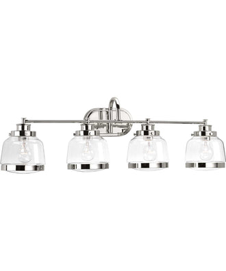 Ideal for a bathroom. Perfect for farmhouse and vintage electric style settings. Subtle polished nickel finish. Crisp clear glass shades. Mount the light fixture facing up or down. Use 4 medium base bulbs that are sold separately (75 W max - LED/CFL/incandescent). compatible with dimmable bulbs. Measures 35.75-inch width by 11.25-inch height by 8.5-inch (extends from wall). Certifications: cULus Damp Location Listed. Pairs with the Saluda, Judson, and Swing collections by Progress Lighting. Our 1-year Limited Warranty guarantees your complete satisfaction with your purchase and includes professional after-sales customer service support.