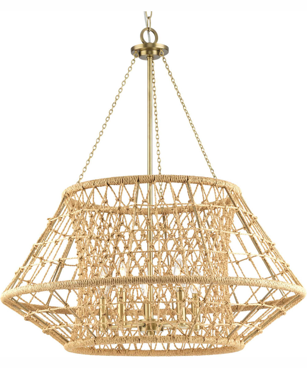 The chandelier's frame is finished in vintage brass, lending it a timeless and elegant appeal. The brass finish complements the natural jute strands perfectly, creating a harmonious blend of materials that adds warmth and character to your home. The plated finish ensures durability and longevity, making this chandelier a lasting addition to your decor.