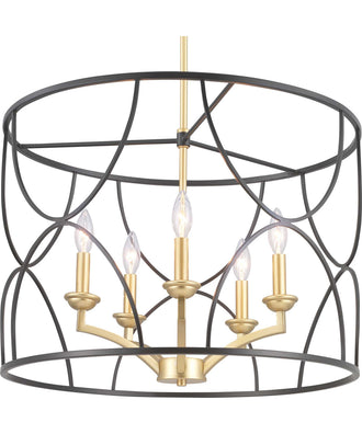 Like a vision within a cloud, a golden cluster candelabra glows from within the sinuous metallic of an outer cage. Exaggerated scale and elegant finishes define Landree’s collection of lighting fixtures. The five-light chandelier works beautifully in an entry foyer, breakfast area, dining room or upscale family room. An excellent choice for Modern and Luxury interiors. Dramatic Black finish with Vintage Gold accents. Measures 23in diameter x 16in ht. Uses five 60-watt max. candelabra base bulbs or LED equivalent (sold separately). Compatible with standard wall dimmer. Progress Lighting products are designed for exceptional quality, reliability, and functionality. Includes installation instructions and mounting hardware. Coordinating fixtures available