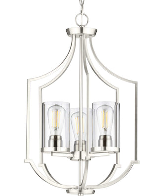 Illuminate your space with the sophisticated charm of the Lassiter 3-Light Foyer Brushed Nickel fixture. This exquisite lighting piece seamlessly blends modern and traditional styles, making it a versatile addition to any home decor. The fixture features square tubing with clean, sharp angles coated in a beautiful brushed nickel finish, creating a striking visual appeal that demands attention. The vintage light sockets add a touch of nostalgia, while the clear glass shades enhance the overall elegance, making this light fixture a true statement piece.
