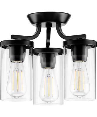 Manifest a swoon-worthy lighting experience with the stunning blend of modern and traditional styles in this one-of-a-kind semi-flush mount. A beautiful black finish coats a handsome rectangular backplate. Striking vintage light sockets boast their bold yet simple demeanors within the safety of sophisticated clear glass shades. Ideal for any hallway, foyer, stairway, or kitchen. Perfect for modern, new traditional, or contemporary settings. Measures 13-inch width by 10-1/2-inch height. Uses three medium base bulbs that are sold separately (60w max - LED or incandescent). Able to be fully dimmable with dimmable bulbs. Includes installation instructions and mounting hardware. Progress Lighting products are designed for exceptional quality, reliability, and functionality.