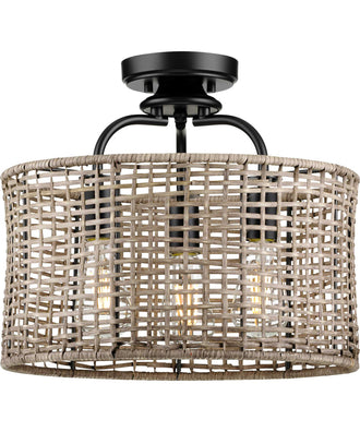 Gather under the organic glow of the Lavelle Collection 3-Light Natural Rattan Textured Black Global Semi-Flush Mount Convertible Ceiling Light. Light sources glow from between the openings of a natural rattan shade that creates an earthy design sure to add an organic touch to the living space it calls home. The smooth, stem, curved arms, and rounded light bases are coated in a textured black finish that complements the shade and adds a pinch of industrial character.