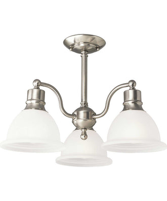 The Madison collection features etched glass with transitional elements. Simplified vintage style. Three-light 20-3/4" semi-flush close-to-ceiling fixture. Brushed Nickel finish.