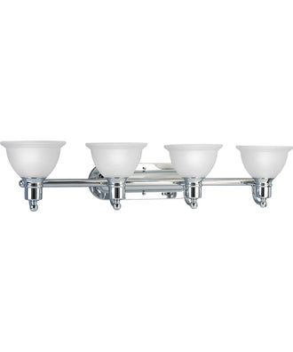 Ideal for a bathroom. Perfect for traditional and transitional style settings. Crisp polished chrome finish. Elegant etched glass shades. Mount the light fixture facing up or down. Use 4 medium base bulbs that are sold separately (100 W max - LED/CFL/incandescent). compatible with dimmable bulbs. Measures 37.5-inch width by 8-inch height by 9-inch (extends from wall). Certifications: UL-CUL Damp Location Listed. Pairs with the Hansford and Drum Shade collections by Progress Lighting. Our 1-year Limited Warranty guarantees your complete satisfaction with your purchase and includes professional after-sales customer service support.