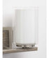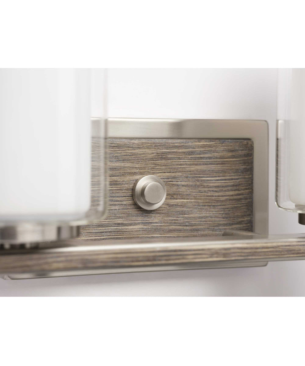 Bring a fresh, organic feel to bath and vanity settings with the Mast two-light bath. A combination of clear and etched glass shades creates the appearance of twin votive candleholders. Faux wood accents finished in a subtly reflective Brushed Nickel complete the style’s nature-inspired look sure to bring a calming influence to bath and vanity settings in industrial and farmhouse interiors.