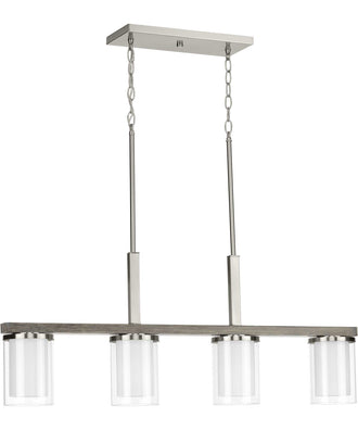 The incorporation of faux wood accents brings a natural and organic feel for coastal and modern farmhouse interiors. An excellent choice for installing over farmhouse dining tables or larger kitchen islands. Four-light island with a simple, clean design. A combination of clear and etched glass shades creates the appearance of a votive candleholder to enhance the style’s calming influence. Linear pendant captures a calming modernism in its sleek lines. Finished in subtly reflective Brushed Nickel. Measures 38 in length X 4-7/8 in wide X 14-3/4 in height, Overall height with stem 80-1/2 in, wire 180 in. Uses four 100-watt max medium base bulbs, or the LED equivalents, that are sold separately. Progress Lighting products are designed for exceptional quality, reliability, and functionality