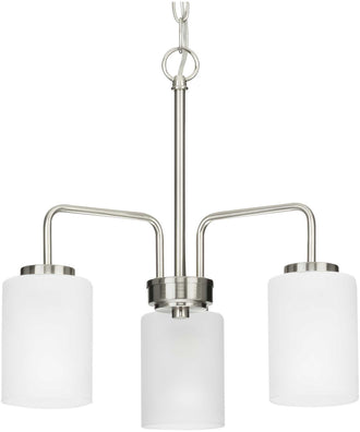 Transform your living space with the Merry 3-Light Etched Glass Transitional Style Chandelier Light in Brushed Nickel. This chandelier boasts a clean, contemporary design that effortlessly combines modern and transitional styles. The sleek tubular frame is coated in a beautiful brushed nickel finish, giving it a sophisticated and timeless appeal. The three cylindrical etched glass shades provide a generous, elegant glow, making it an ideal centerpiece for any room.