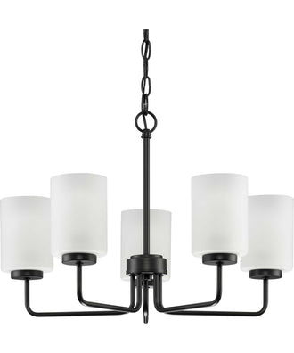 The Merry 5-Light Etched Glass Transitional Style Chandelier Light in Matte Black is a stunning addition to any home. Its clean-lined tubular frame, coated in a beautiful matte black finish, seamlessly blends transitional and modern styles. This chandelier's sleek design features five crisp etched glass shades that emit a generous, elegant glow, transforming your favorite living space into a modern retreat.