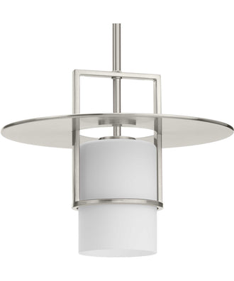 The Mystic 1-Light Contemporary Pendant in Brushed Nickel is a stunning addition to any modern or contemporary space. This pendant light features a sophisticated design that combines geometric forms with a sleek brushed nickel finish. The centerpiece of this fixture is a cylindrical glass shade made from etched white glass, which is elegantly supported by a crisp rectangular frame. The expansive metal brim adds both substance and distinction, creating a unique and eye-catching piece.