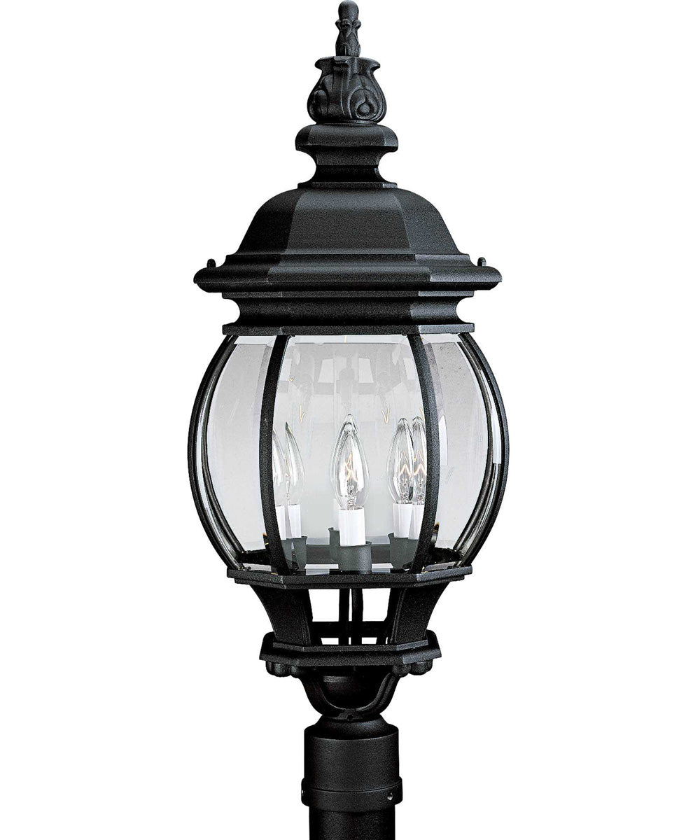 Detailed finials, end caps and scroll work in a durable power coat finish, featuring clear beveled glass panels and cast aluminum frames. Four light post lantern.