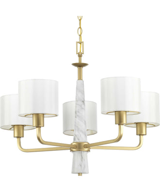 The Palacio 5-Light White Silk Fabric Shade Luxe Chandelier Light in Vintage Gold is a testament to sophisticated design and timeless elegance. This chandelier features a striking combination of a vintage gold finish paired with faux white marble columns, creating a luxurious and contemporary aesthetic. The white silk shades add a touch of softness and complement the gold accents perfectly, making this chandelier a statement piece in any interior setting.