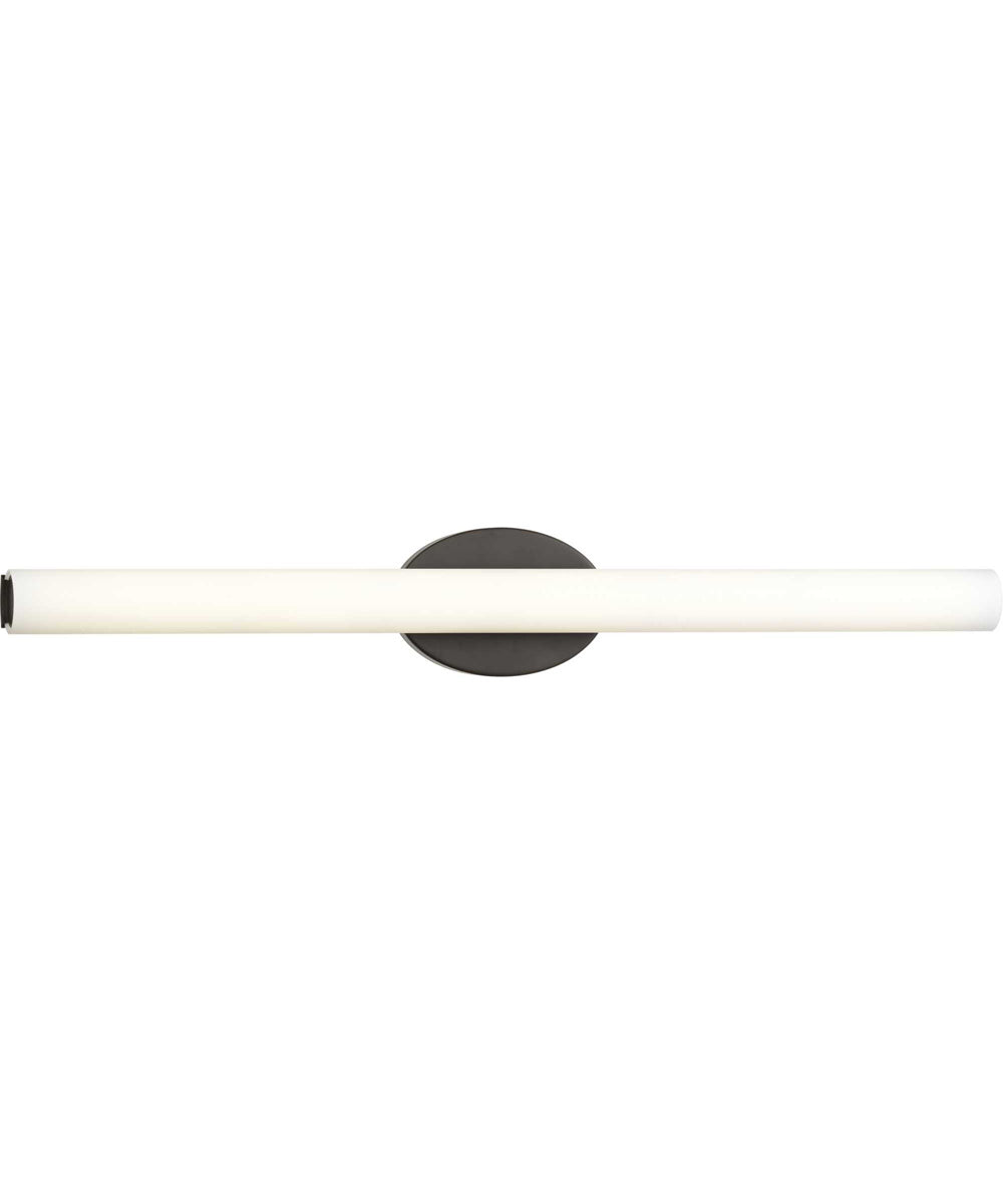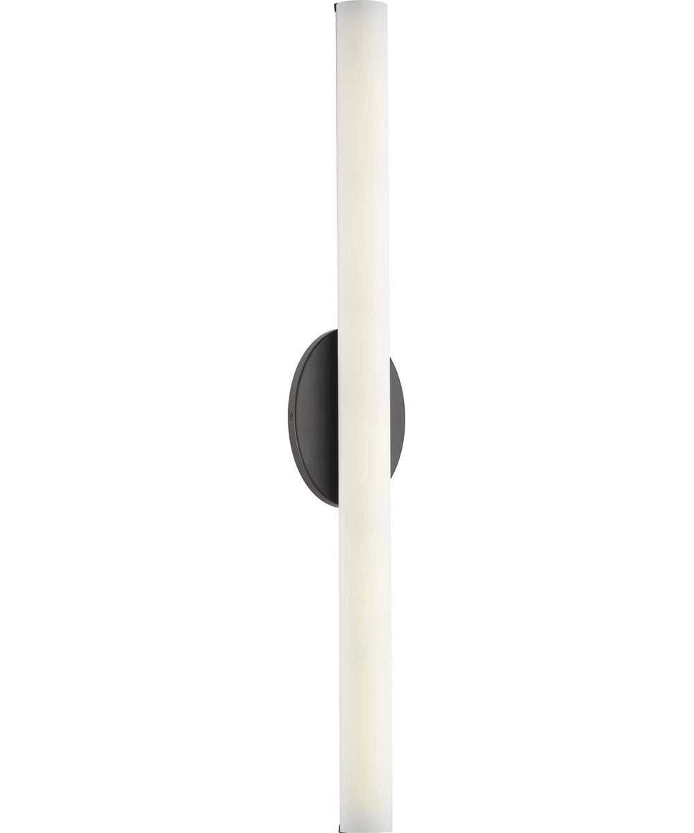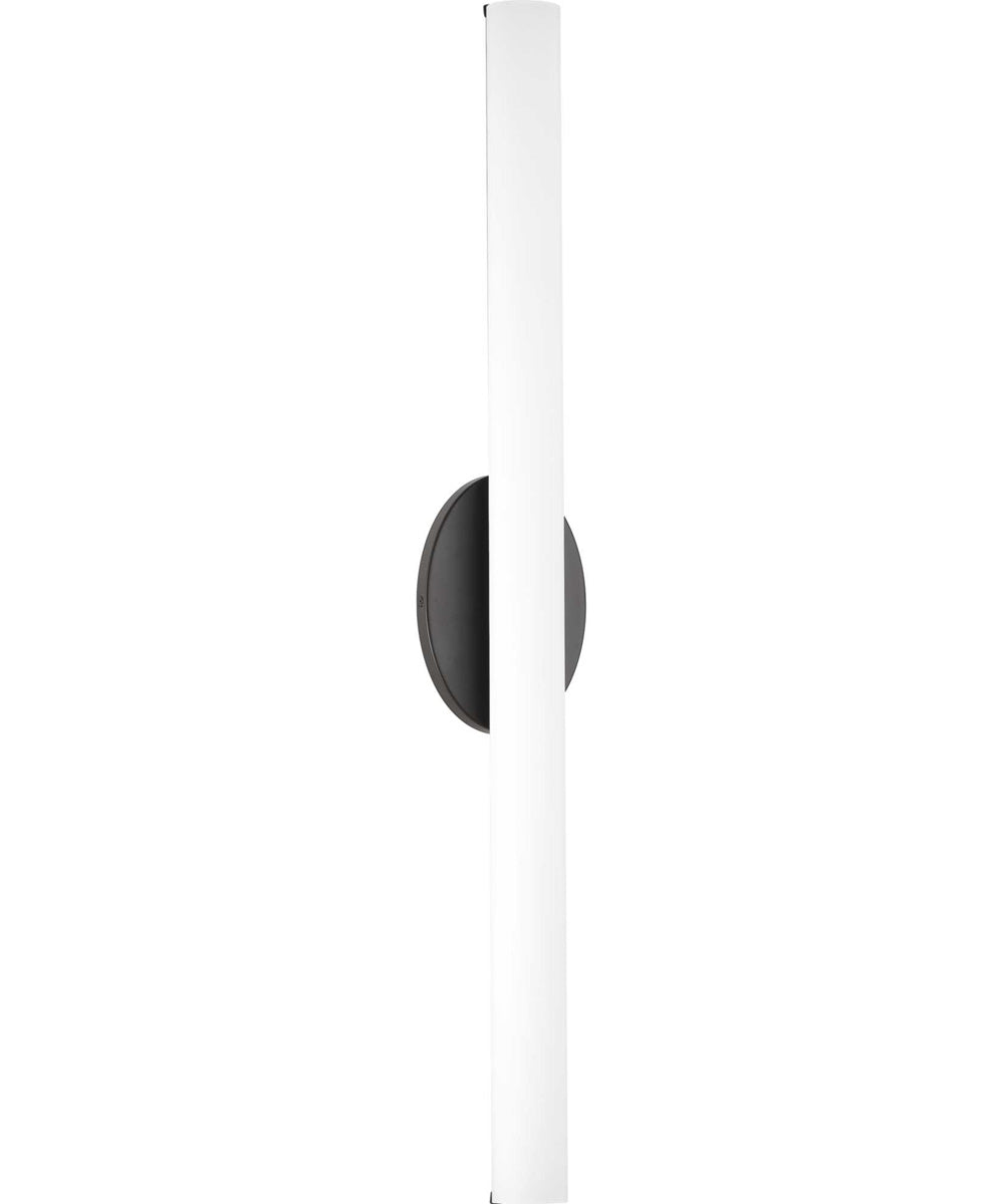 Ideal for a bathroom. Perfect for luxe, mid-century modern, and modern style settings. Handsome architectural bronze finish. Elegant etched white glass shade. Fixture can mount horizontal and vertical. Includes 1 integrated LED (50 W), 2872 lumens, 3000 K, 90 CRI, dimmable. Measures 4.75-inch width by 32-inch height by 2.75-inch (extends from wall). Certifications: cETLus Damp Location Listed. Pairs with a variety of lighting fixtures by Progress Lighting. Our 5-year Limited Warranty guarantees your complete satisfaction with your purchase and includes professional after-sales customer service support.