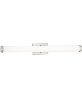 Ideal for a bathroom. Perfect for modern style settings. Beautiful brushed nickel finish. Crisp white acrylic shade. Fixture can mount horizontal and vertical. Includes 1 integrated LED (33 W), 2600 lumens, 3000 K, 90 CRI, dimmable. Measures 36-inch width by 4.75-inch height by 4-inch (extends from wall). Certifications: cETLus Damp Location Listed. Pairs with a variety of lighting fixtures by Progress Lighting. Our 5-year Limited Warranty guarantees your complete satisfaction with your purchase and includes professional after-sales customer service support.