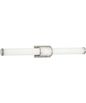 Ideal for a bathroom. Perfect for modern style settings. Beautiful brushed nickel finish. Crisp white acrylic shade. Fixture can mount horizontal and vertical. Includes 1 integrated LED (33 W), 2475 lumens, 3000 K, 90 CRI, dimmable. Measures 36-inch width by 4.75-inch height by 4.5-inch (extends from wall). Certifications: cETLus Damp Location Listed. Pairs with a variety of lighting fixtures by Progress Lighting. Our 5-year Limited Warranty guarantees your complete satisfaction with your purchase and includes professional after-sales customer service support.