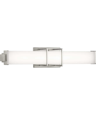 Ideal for a bathroom. Perfect for modern style settings. Beautiful brushed nickel finish. Crisp white acrylic shade. Fixture can mount horizontal and vertical. Includes 1 integrated LED (23 W), 1550 lumens, 3000 K, 90 CRI, dimmable. Measures 24-inch width by 4.75-inch height by 4-inch (extends from wall). Certifications: cETLus Damp Location Listed. Pairs with a variety of lighting fixtures by Progress Lighting. Our 5-year Limited Warranty guarantees your complete satisfaction with your purchase and includes professional after-sales customer service support.