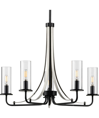 Introducing the Riley 5-Light Clear Glass New Traditional Chandelier Light in Matte Black, a stunning blend of sleek simplicity and natural beauty. This chandelier features clear glass shades that provide rejuvenating illumination, perfect for creating a serene and tranquil atmosphere in any room. The shades are elegantly perched on a matte black frame accented with brushed nickel, adding a touch of sophistication and modernity to your decor.