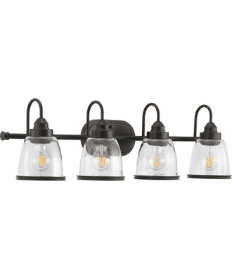 Ideal for a bathroom. Perfect for coastal, farmhouse, and transitional style settings. Handsome antique bronze finish. Crisp clear glass shades. Mount the light fixture facing up or down. Use 4 medium base bulbs that are sold separately (60 W max - LED/CFL/incandescent). compatible with dimmable bulbs. Measures 32.5-inch width by 9.5-inch height by 7.75-inch (extends from wall). Certifications: cULus Damp Location Listed. Pairs with the Litchfield, Range, and Piedmont collections by Progress Lighting. Our 1-year limited warranty guarantees your complete satisfaction with your purchase and includes professional after-sales customer service support.