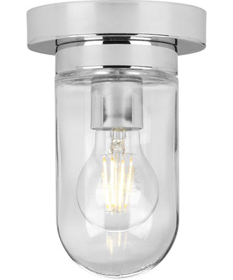 Ideal for over a kitchen island or sink, in a hallway, or wherever focused light is desired. Offers a clean, minimalist approach ideal for coastal, modern farmhouse, and modern interiors. One-light flush mount ceiling fixture with simple, clean lines. A clear, blown glass shade hangs from a double-banded, round ceiling plate. Finished in Polished Chrome. Measures 5-1/8 in diameter X 7-5/8 in height. Uses one 60-watt max medium base bulb, including the LED equivalent, that is sold separately. Includes installation instructions and mounting hardware. Progress Lighting products are designed for exceptional quality, reliability, and functionality