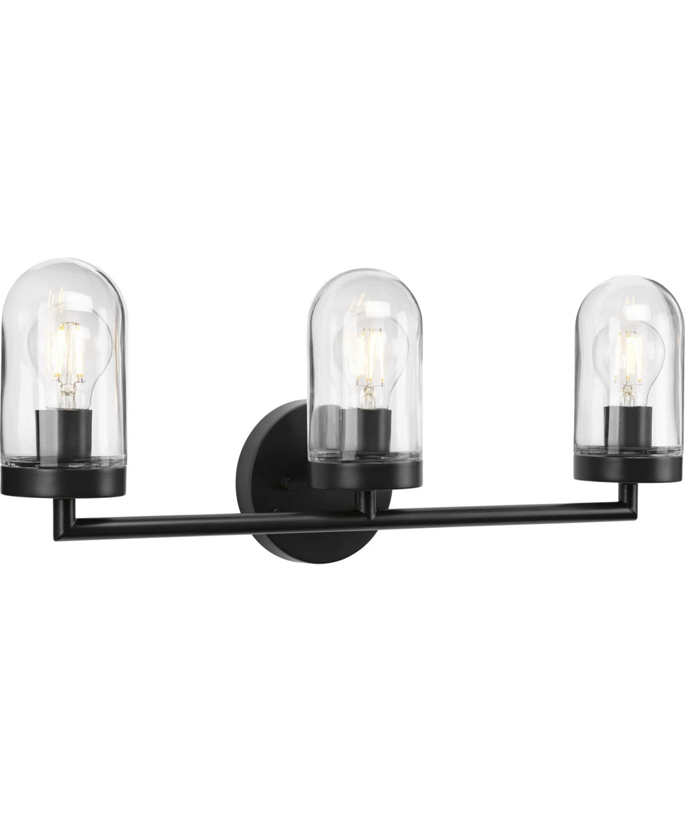 Ideal for a bathroom. Perfect for coastal, farmhouse, modern, and urban industrial style settings. Gorgeous graphite finish. Crisp clear glass shades. Mount the light fixture facing up or down. Use 3 medium base bulbs that are sold separately (60 W max - LED/CFL/incandescent). compatible with dimmable bulbs. Measures 23.125-inch width by 9.125-inch height by 5.375-inch (extends from wall). Certifications: cULus Damp Location Listed. Pairs with a variety of lighting fixtures by Progress Lighting. Our 1-year Limited Warranty guarantees your complete satisfaction with your purchase and includes professional after-sales customer service support.