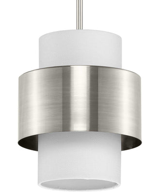 The Silva Collection uses a dramatic contrast of finish and material to present a captivating design. A white linen shade encompassed by a stunning metallic drum coated in a subtle brushed nickel finish establishes a clean, modern, uplifting statement. This fixture is part of the Progress Lighting Design Series, a lighting collection offering fashionable styles and affordable luxury lighting for the home.