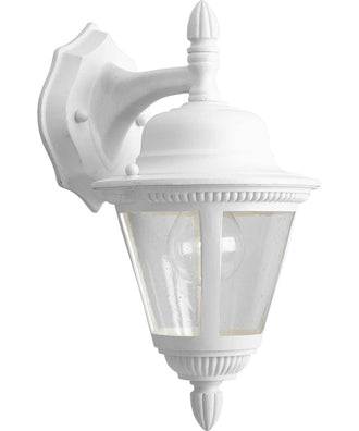Add a touch of rustic appeal and classic styling with beaded detailing in the Westport collection. Clear seeded glass compliments the durable powder coat finish in die-cast aluminum frames. One-light small wall lantern. White finish.