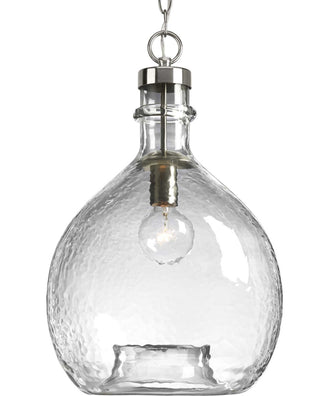 Inspired by a beautiful wine cask design. Zin pendants are artfully formed from one large piece of glass. Brushed Nickel finish with textured clear glass. Pendant uses one 100W max. medium base lamp (sold separately). Create a customized look for Rustic Farmhouse and Modern Farmhouse to Urban Industrial settings by grouping several pendants together in a kitchen, entryway or living room setting. Progress Lighting Design Series, a collection offering fashionable styles and affordable luxury.