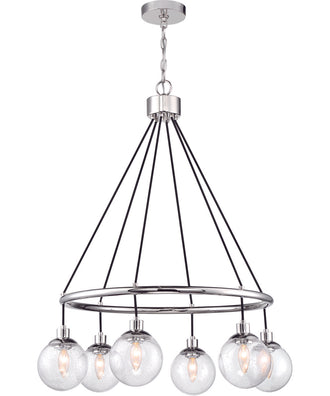 The Que 6-Light Chandelier in Chrome is a stunning centerpiece that effortlessly combines modern elegance with timeless appeal. Its sleek, chrome finish exudes sophistication, while the clear seeded glass globes add a touch of vintage charm. The chandelier's unique silhouette, featuring a circular frame suspended by slender rods, creates a visually captivating design that will enhance any room's aesthetic.
