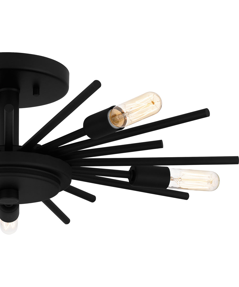 The Mesquite semi-flush mount radiates modern style with its geometric sputnik design and choice of matte black or weathered brass finish. Hang this versatile piece in a variety of spaces including a bedroom, hallway, home office , or living room. Pair with vintage filament bulbs for an added element of flair.