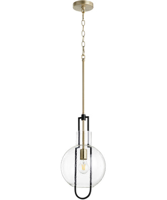 Enhance your living space with the sophisticated charm of the 1-light Pendant Noir with Aged Brass by Quorum. This pendant light boasts a sleek and modern design that seamlessly blends contemporary aesthetics with timeless elegance. The fixture features a stunning Noir finish complemented by Aged Brass accents, creating a striking visual contrast that is sure to catch the eye. The clear glass globe encases the bulb, adding a touch of transparency and lightness to the overall design.