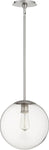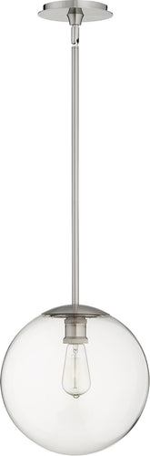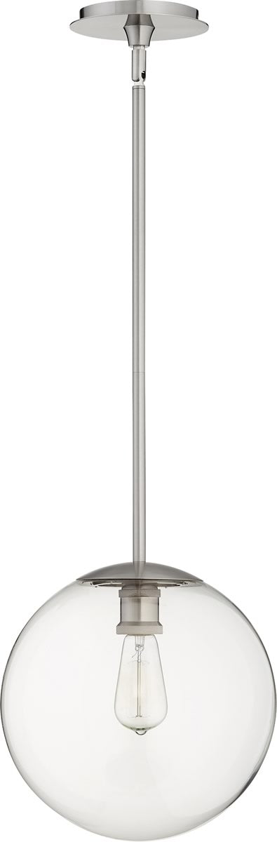 Introducing the 12"W 1-light Pendant in Satin Nickel, a stunning addition to any home or office space. This pendant light features a sleek, modern design with a clear glass globe that beautifully encases the bulb, adding a touch of sophistication and elegance to your decor. The satin nickel finish provides a contemporary flair, making it a versatile piece that complements various interior styles, from transitional to modern and even minimalist themes.