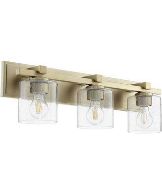 Picture this 3-light Bath Vanity Light in your home or office. Refresh your room with this Aged Brass w/ Clear/Seeded-finished Bath Vanity Light by Quorum.