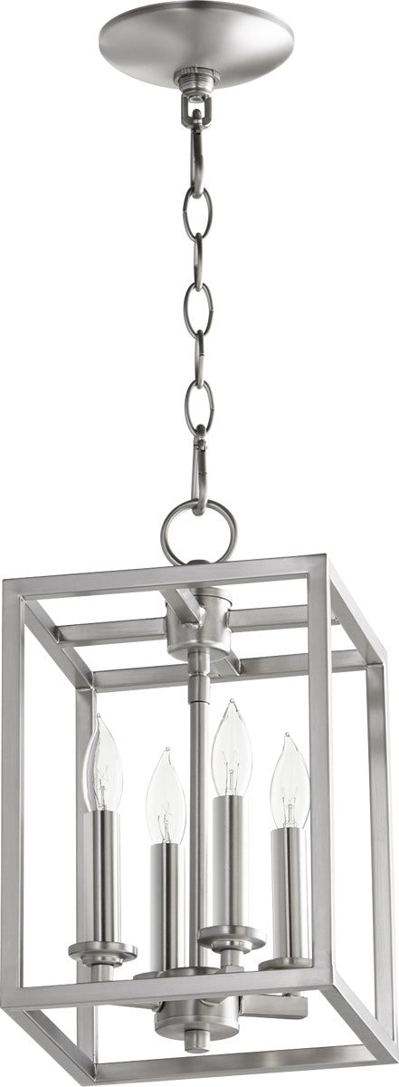 Transform your entryway or hallway with the sophisticated 8"W 4-light Entry Foyer Hall Chandelier in Satin Nickel. This stunning chandelier by Quorum features a sleek, transitional style that seamlessly blends modern and classic elements. The satin nickel finish adds a touch of elegance and contemporary flair, making it a versatile addition to any home or office decor.
