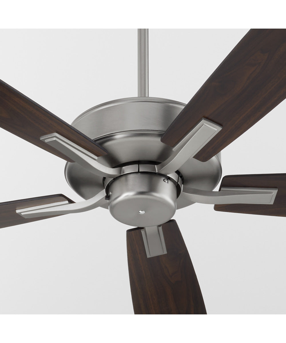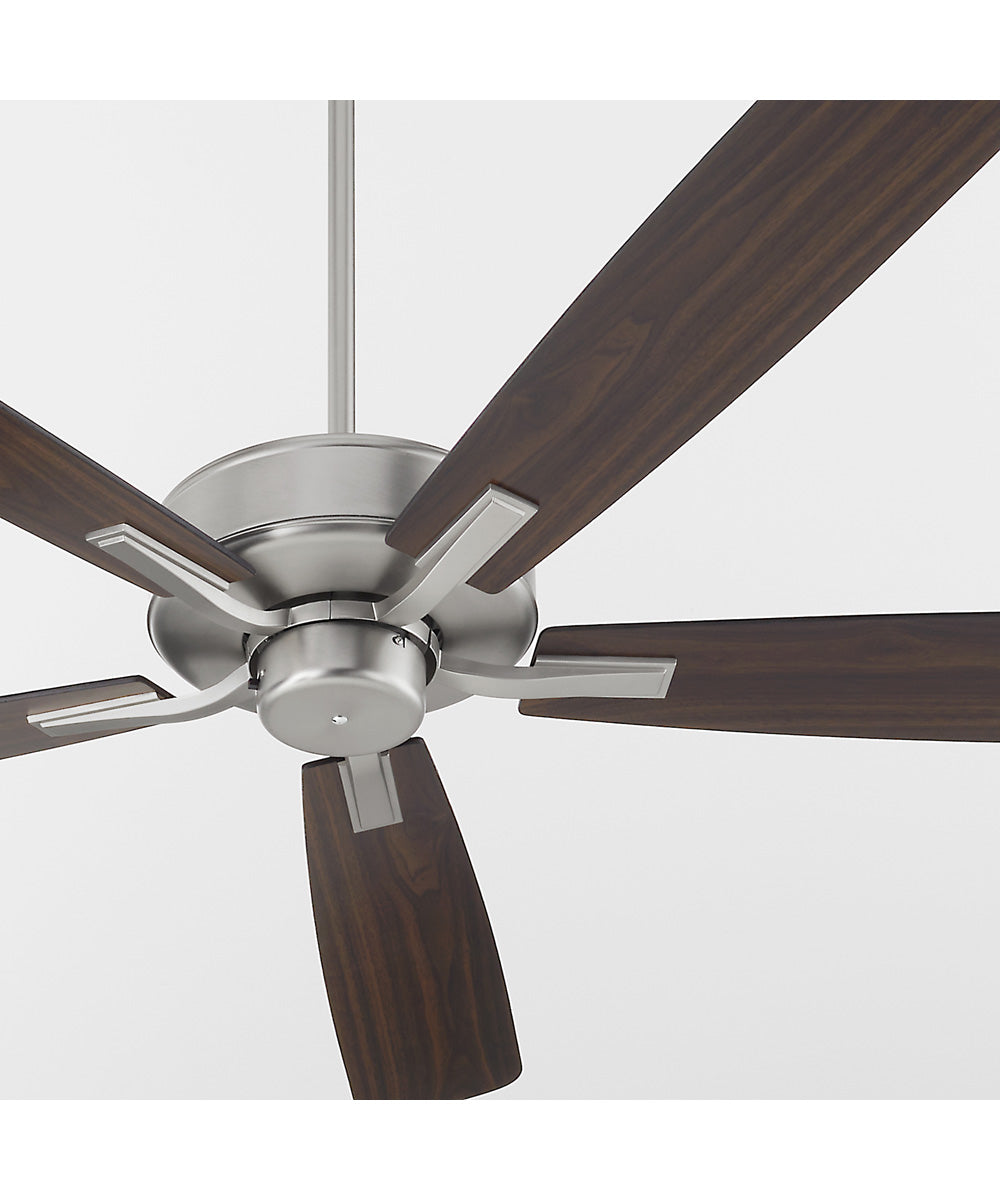 The 60" Ovation Ceiling Fan in Satin Nickel is the perfect blend of style and functionality. This stunning ceiling fan features a sleek satin nickel finish that exudes modern elegance, making it a versatile addition to any contemporary home or office space. The fan's design is accentuated by its five blades, which come in a sophisticated silver and walnut finish, adding a touch of warmth and luxury to your interiors.