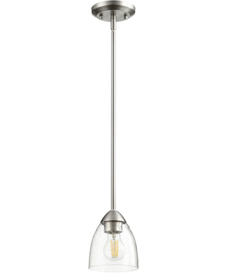 The 6" Barkley 1-light Pendant in Satin Nickel with Clear/Seeded finish is a stunning addition to any home or office space. This pendant light features a sleek and modern design that effortlessly blends with various interior styles. The satin nickel finish adds a touch of sophistication and elegance, while the clear seeded glass shade provides a unique texture and visual interest.