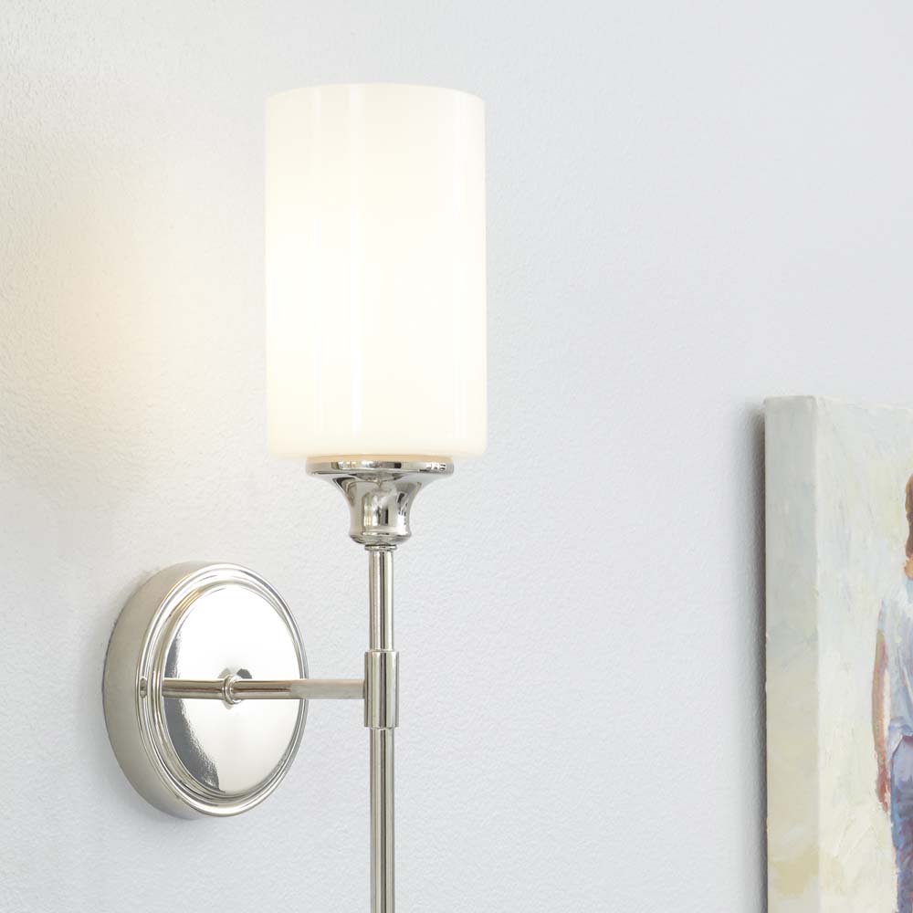 The polished nickel finish and opal shade of the Celeste 1-light Wall Mount Light Fixture make it a versatile choice that works well with numerous room themes. It pairs beautifully with modern, contemporary, and transitional décor, adding a touch of elegance and sophistication. The fixture's clean lines and understated design allow it to blend seamlessly with various furniture styles and color palettes, making it a timeless addition to any space.