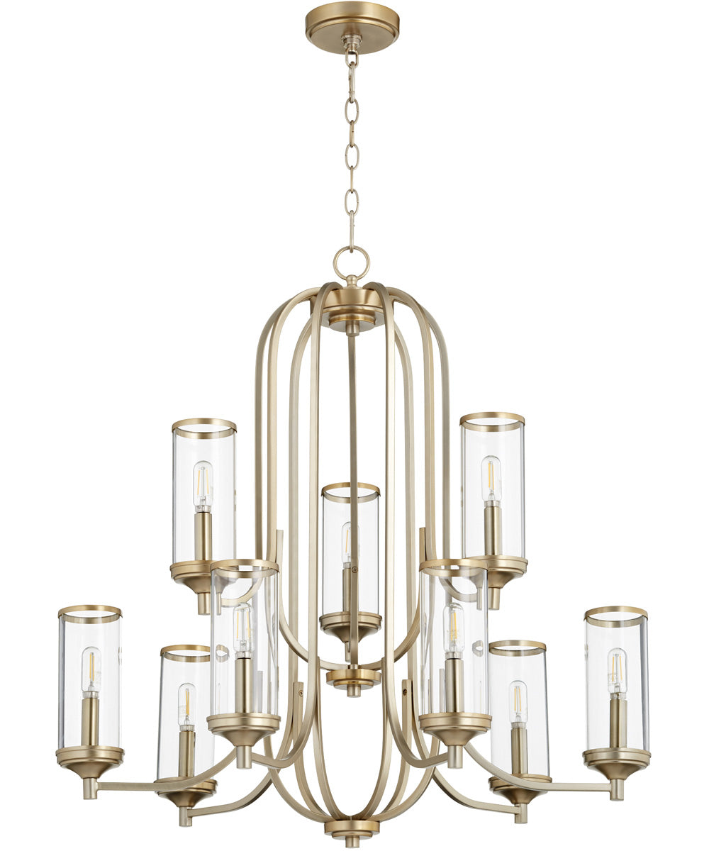 Picture this 9-light Chandelier in your home or office. Refresh your room with this Aged Brass -finished Chandelier by Quorum.