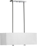 The 30"W Copeland 4-Light Pendant in Satin Nickel by Quorum International is a sophisticated lighting fixture that adds a tasteful touch to any room. With its sleek satin nickel finish, this pendant light exudes modern elegance. The rectangular shade, covered in a pristine white fabric, offers a clean and contemporary look that seamlessly blends with various interior styles.