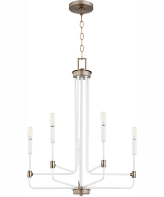 Enhance your home with the Davies 5-light Chandelier in Studio White with Dark Brass finish by Quorum. Its elegant design, versatile style, and high-quality construction make it a perfect choice for any room. Don't miss out on the opportunity to transform your space with this stunning lighting fixture. Order now and experience the perfect blend of form and function.
