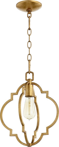 The 11" Dublin 1-light Pendant in Gold Leaf is a stunning addition to any home or office space. This pendant light features a sophisticated design with a quatrefoil shape that adds a touch of elegance and charm to your interior decor. The gold leaf finish enhances its luxurious appeal, making it a perfect centerpiece for any room.