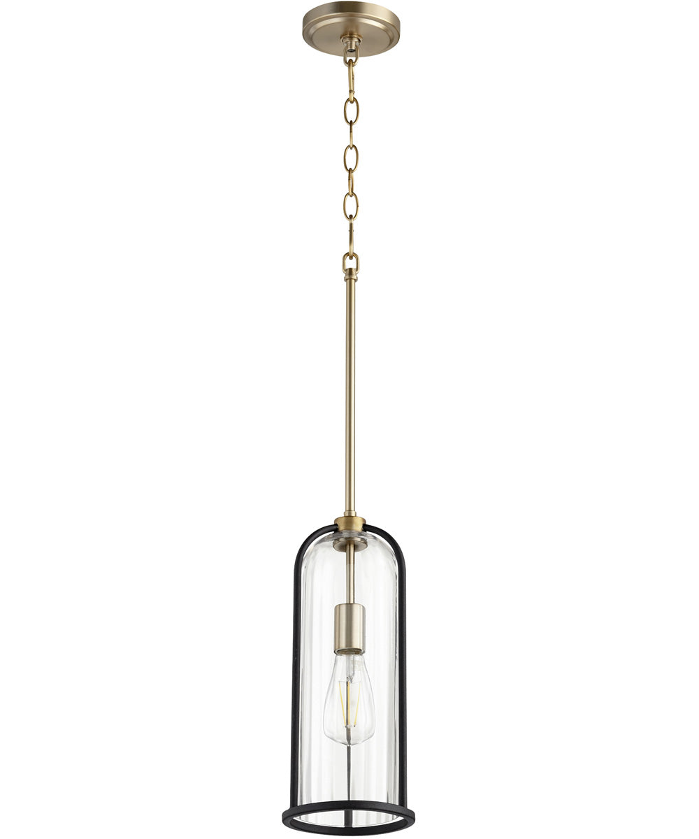 Introducing the 6"W Espy 1-light Pendant in Noir with Aged Brass finish by Quorum, a perfect blend of elegance and contemporary design. This pendant light features a sleek, modern silhouette with a clear glass shade that beautifully encases the bulb, allowing it to shine brightly and illuminate your space. The combination of Noir and Aged Brass finishes adds a touch of sophistication and timeless charm to any room.
