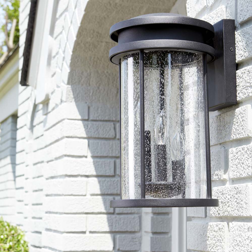 Outdoor wall lanterns, also referred to as porch lights or garage lights, are mounted onto a wall. Usually they are ideal next to an entrance or either side of a garage. They will light up the local area and most of the yard, although a larger space may need more than one. Being fixed to the wall they place the light closer to the building, ideal for entering or exiting, or to help with parking. They are installed electrically as a hardwired fixture and usually operated by a wall switch or sensor.