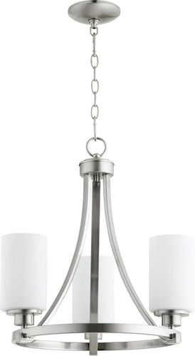 The 18" W Lancaster 3-light Chandelier in Satin Nickel is the epitome of transitional style, seamlessly blending traditional and contemporary design elements. Its sleek satin nickel finish exudes a modern appeal, while the gracefully curved arms add a touch of classic elegance. The chandelier features three cylindrical satin opal shades that provide a soft, diffused light, creating a warm and inviting ambiance in any room.